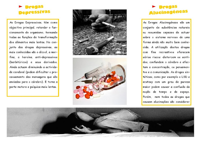 As drogas depressivas, têm como objectivo principal, retardar o funcionamento do organismo, tornando todas as funções metabólicas mais lentas. No conjunto das drogas depressoras, as mais conhecidas são o álcool, os soníferos, a heroína, a morfina, a cola de sapateiro, os remédios ansiolíticos e antidepressivos (barbitúricos) e seus derivados.
