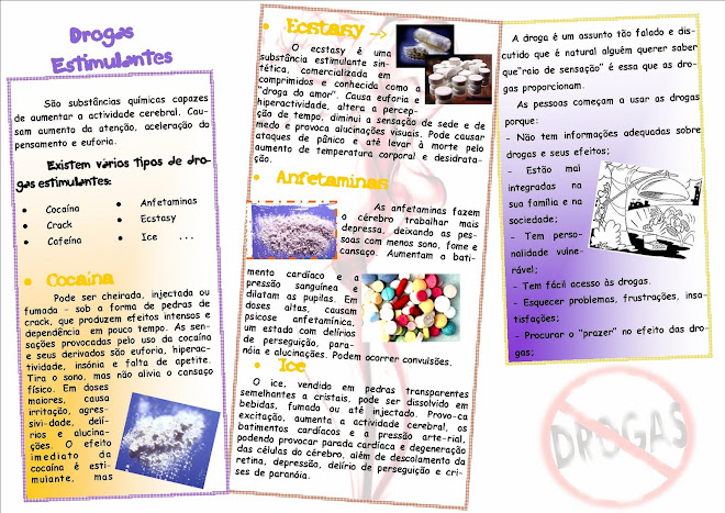 Estimulantes - produzem aumento da actividade pulmonar, diminuem a fadiga, aumentam a percepção ficando os demais sentidos activados. Exemplos: cocaína, ecstasy, crack, anfetaminas, etc.